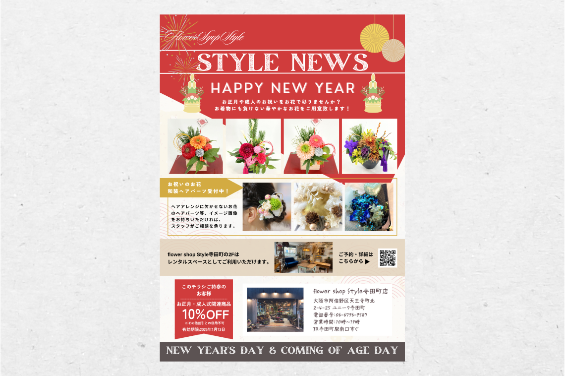 A florist's flyer for the New Year's Day and Coming of Age Day.